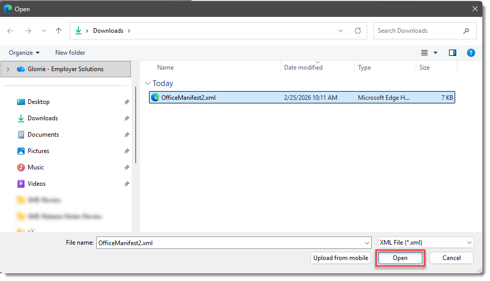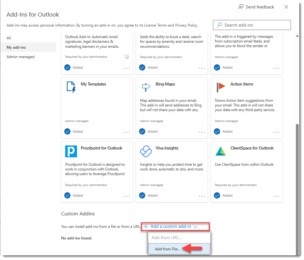 Note: If you plan to use the Add From File... option, a prerequisite step is to download the file so that you can browse to it on your computer. To do this, go to the following location and then, use Ctrl+ S to save the file as OfficeManifest2.xml: