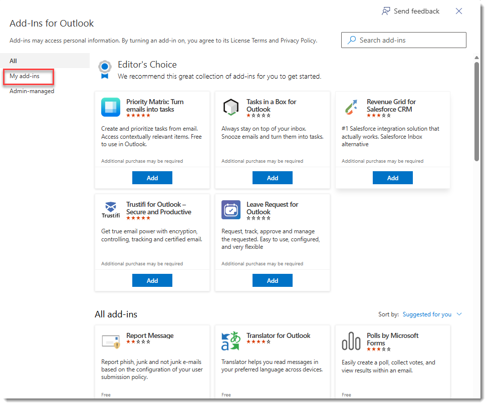 On the left pane, click My add-ins.