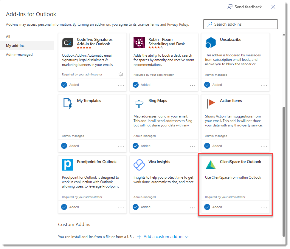 A progress window may briefly display. Once the install is complete, the ClientSpace for Outlook tile displays on the My add-ins tab of the Add-Ins for Outlook page: