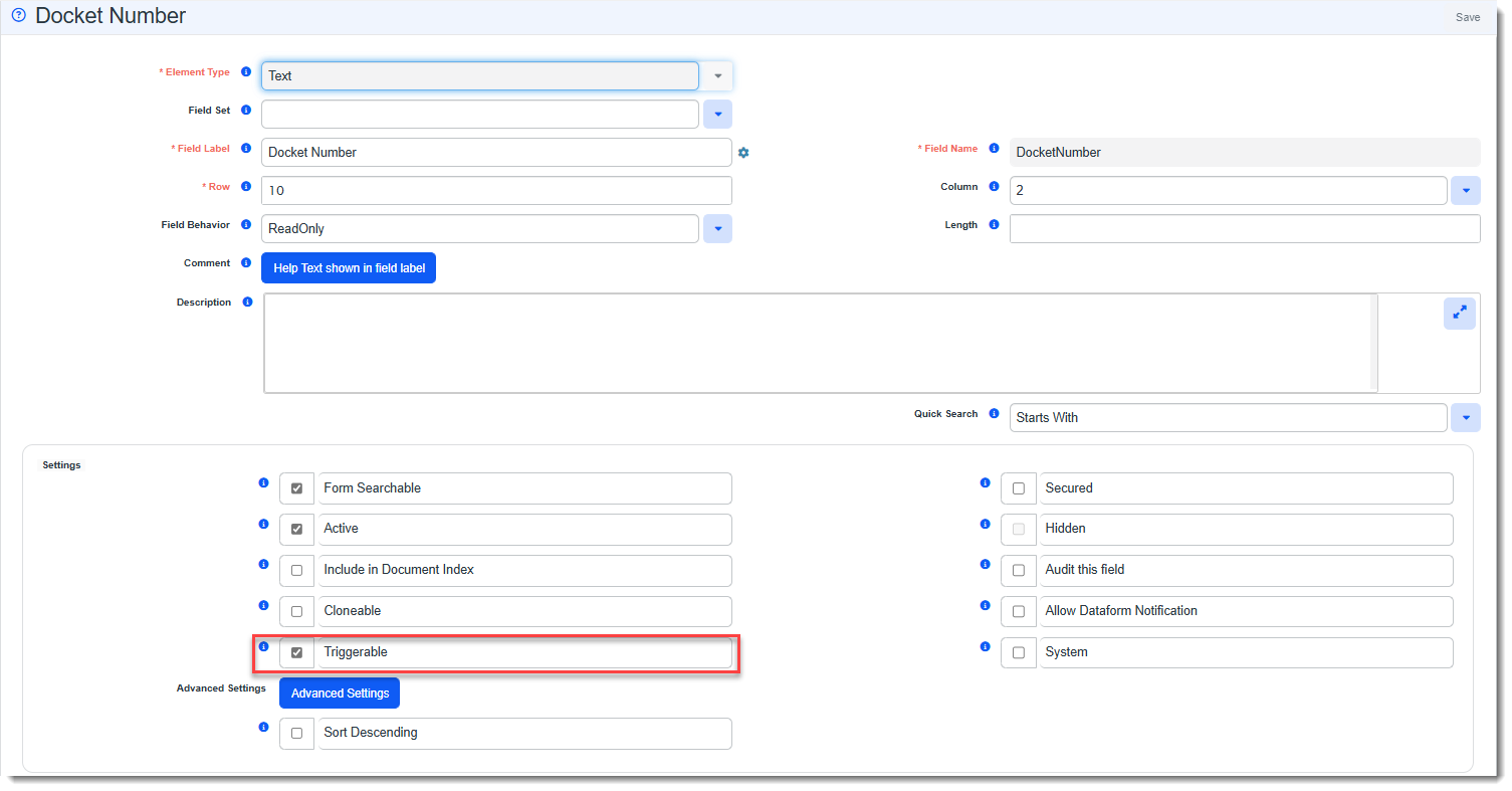 The following image shows the Docket Number field details. Note that you can optionally set the Triggerable flag on a field as we have done here so that the field can be used in workflows.