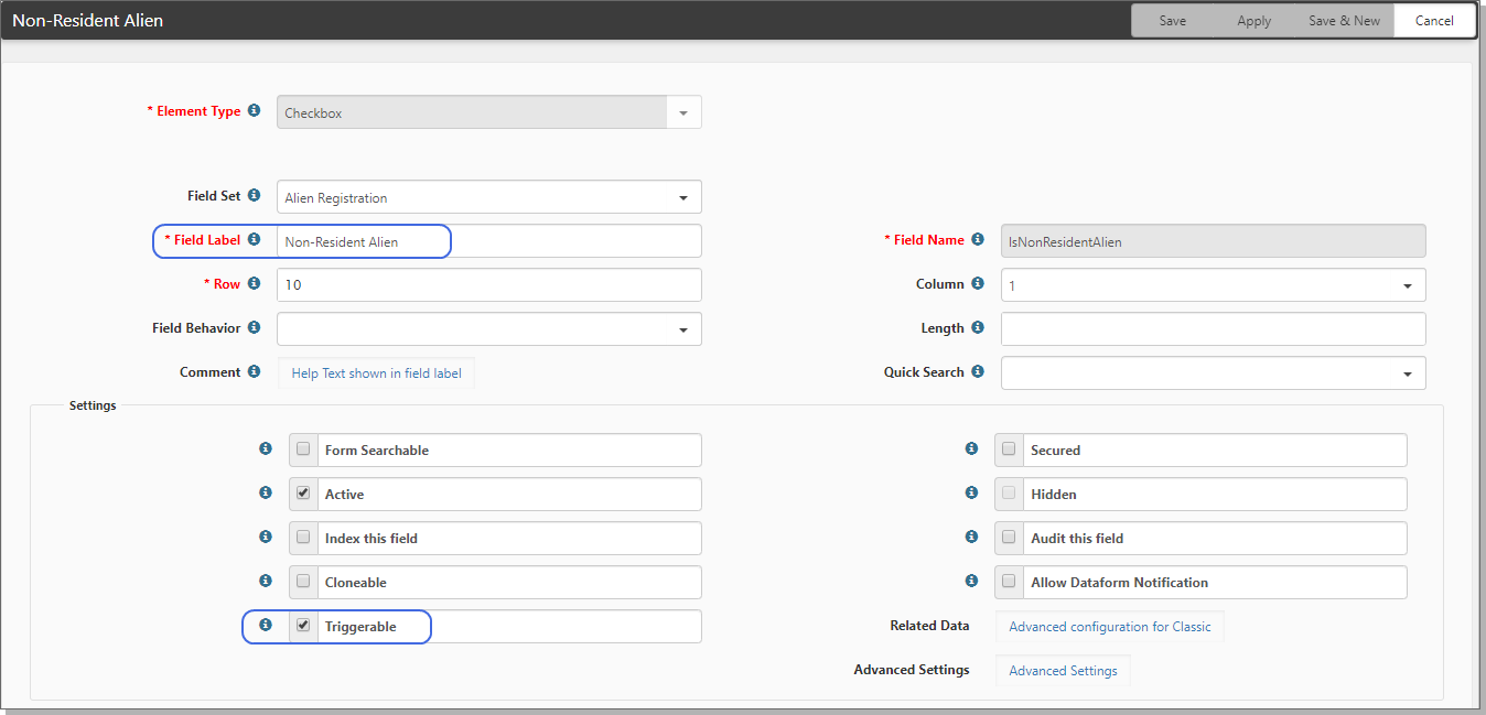 The following image shows the field Non-Resident Alien, which is located in the Alien Registration fieldset.