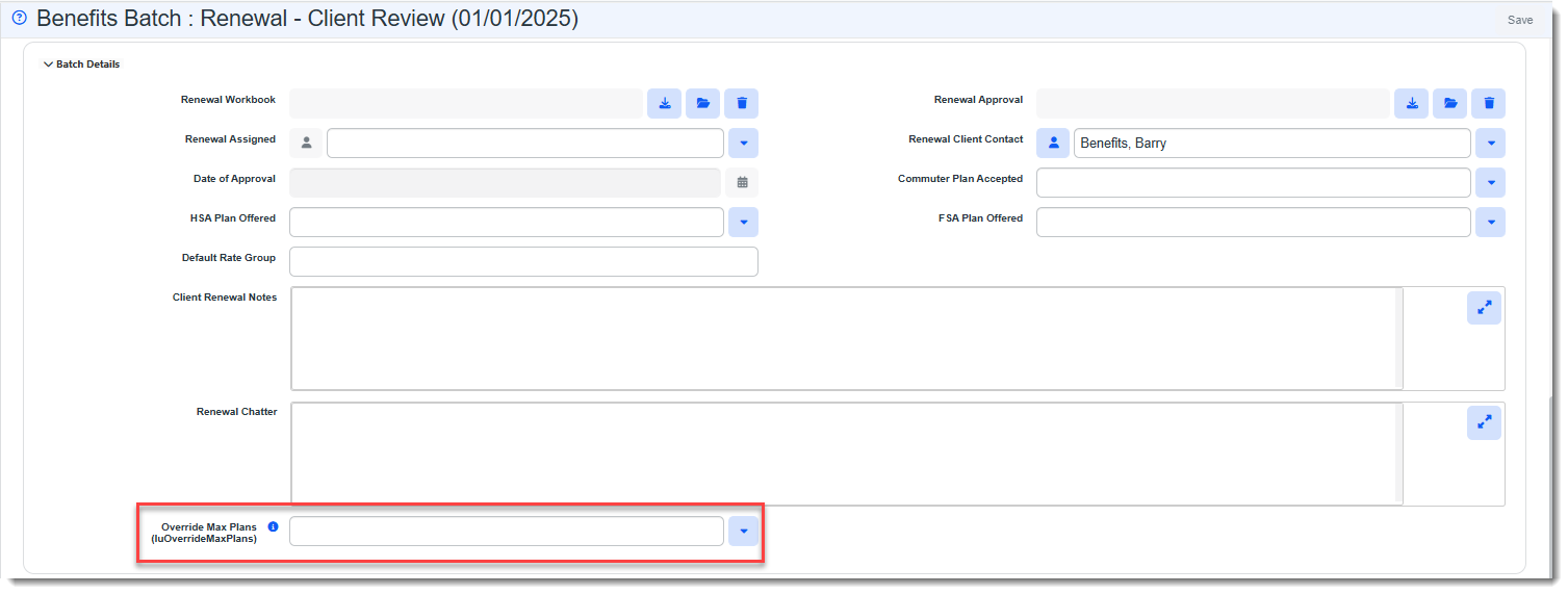 As HE_RequiredPlanMax is a hard error message method, when it is triggered, a user cannot proceed with saving until they adjust the plans, unless the Override Max Plans field is set to Yes on the Benefits Batch. As SE_RequiredPlanMax is a soft error message method, the user can click Save Anyway to save the current plan configurations. Note: Be certain to add BPM (Benefit Plan Manager) to the Execution Pipeline of the business rule configuration. Step 3: Optionally, if you are using the HE_RequiredPlanMax hard error message method, you can set the Override Max Plans lookup field value on the Benefits Batch dataform on a per batch basis. This allows you to override the Max Number of Plans setting(s) on a "per batch" basis when you are using the HE_RequiredPlanMax hard error message method. Valid lookup values are Yes, No or blank. When set to Yes, users can add unlimited plans per category. When set to No or blank, any Max Number of Plans values set for each benefit plan category are evaluated upon Apply or Save and the HE_RequiredPlanMax hard error message is triggered if any of the configured values are exceeded. Also see Business Rule Methods and Adding a Benefits Batch. |