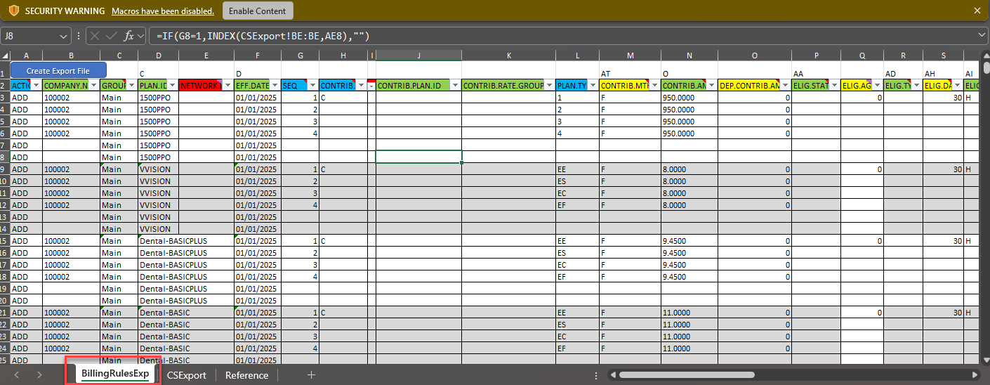 The CSExport and Reference tabs are removed. Only the BillingRulesExp tab remains for export to PrismHR.