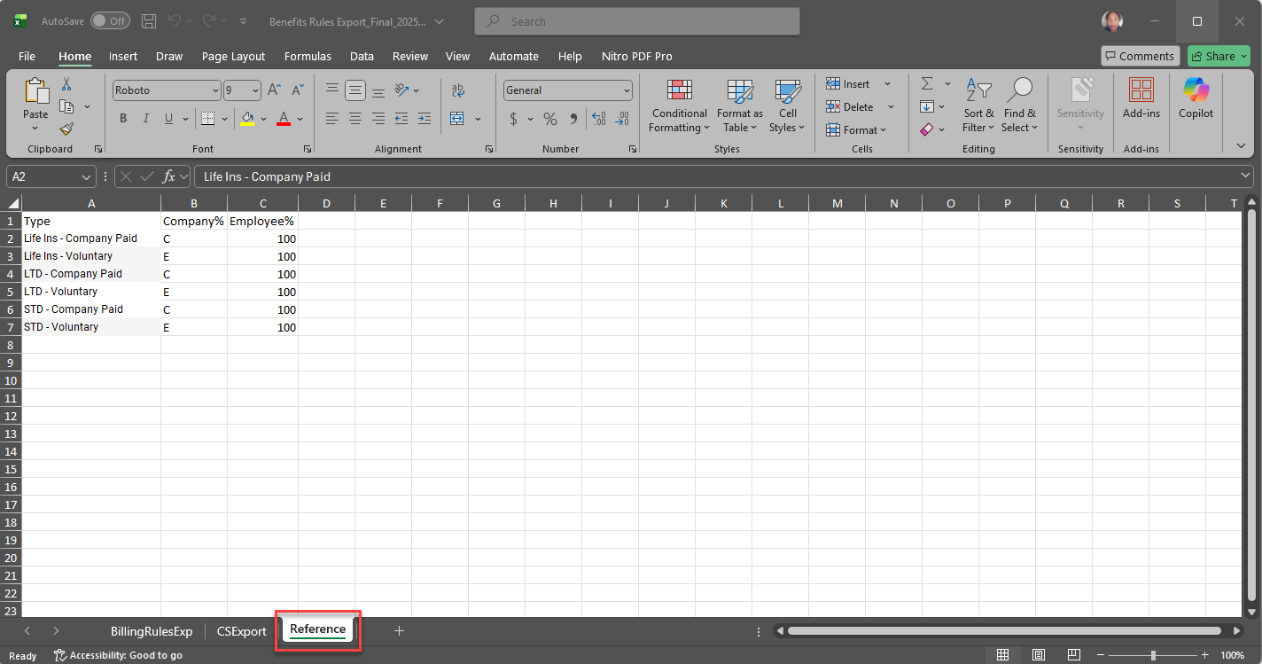 Reference: Displays a breakout of the percentage of coverage being provided by each plan type and whether is an Employee (E) or Company (C) contribution. Use this tab to verify calculations. Once you click Create Export File in the next step this tab is removed and does not export to PrismHR.