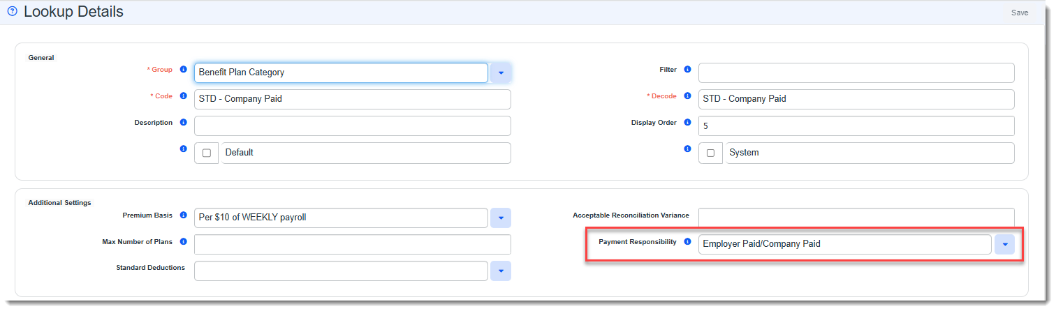 The rule is Active by default. The Payment Responsibility field of "out-of-the-box" lookup detail records that include the word "Company Paid" or "Voluntary" in the lookup Decode value are pre-configured for you. If there are custom lookups, you must update the Payment Responsibility field of the Benefit Plan Category lookup detail records (System Admin
