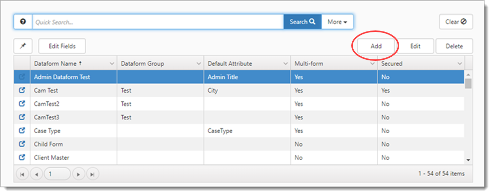Advanced planning can save time after you publish the dataform and start to collect data. After you have determined how you would like to build out your new dataforms, you can begin the process. The first step is to add the dataform. This process creates a new table in the SQL database with the predetermined system columns.