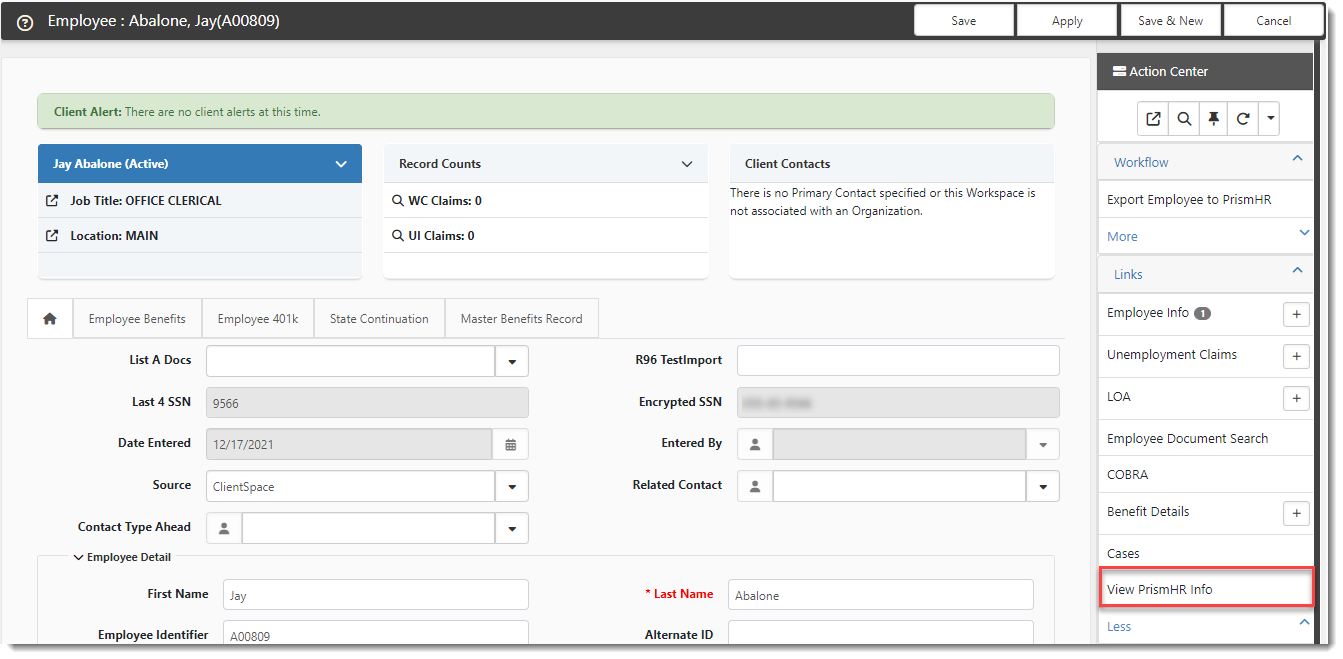 The View PrismHR feature is a link that allows you to verify an employee's information in the PrismHR application, without needing to open the application. You can continue working in ClientSpace and click a link to view employee information.