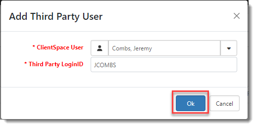 The Add Third Party User dialog box opens. This is where you add user records for each user who will connect from ClientSpace to PrismHR to access employee information.