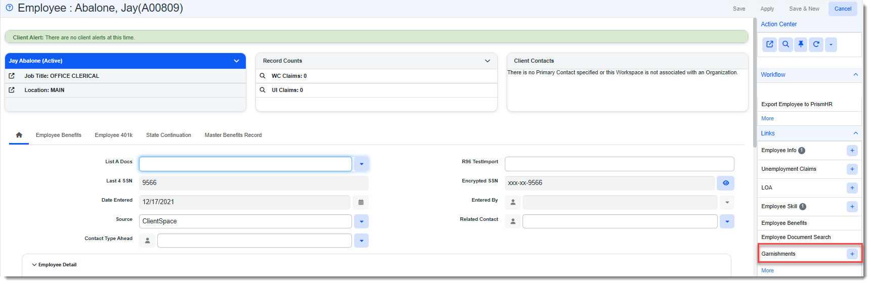 If there is only one record for the selected employee: The record displays when you click the Action Center Garnishments link.