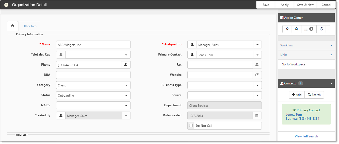 - From an open Organization, in the Action Center, expand Contacts.