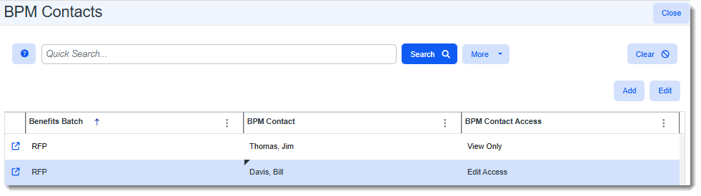 Added Support for Multi-Contact BPM Access with View or Edit Access Permissions You can now add up to twenty (20) total Active BPM contacts on a Benefits Batch (including the Renewal Client Contact) and grant them View Only or Edit access to the batch in BPM.