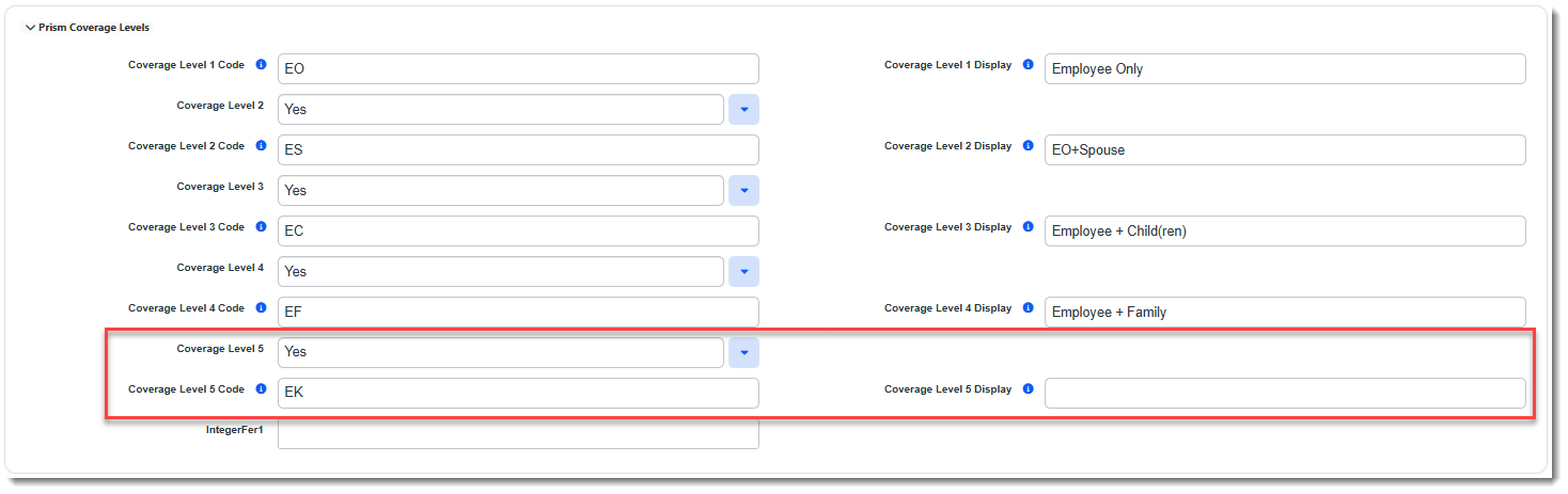 Domestic Partner (EK) Coverage Level Now Displays in BPM Previously, when Coverage Level 5 for Domestic Partner (EK) was added to a Benefit Plan in ClientSpace, it did not display in BPM. Now, Coverage Level 5 displays in BPM. Note: If you set the Coverage Level 5 field to Yes on the Benefit Plan to display it without entering display label text in the Coverage Level 5 Display field (as shown in the image below), the default display text in BPM will be "Domestic Partner". SeeConfiguring the Benefits Plan Prism Coverage Levels Fieldset. |