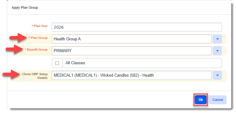 Added Ability to Clone Plan Setup Details Using "Apply Plan Group" Function The existing "Apply Plan Group" function has been enhanced to allow you to clone Offered Benefit Plan (OBP) fields located in the Setup Details fieldset from an existing OBP to all of the OBPs within the Plan Group and Benefit Group (or all benefit groups if you select All Classes) specified on the Apply Plan Group form. To support this feature, a new field named Clone OPB Setup Details was added to the Apply Plan Group form. This is where you specify the "clone from" OPB. Note: