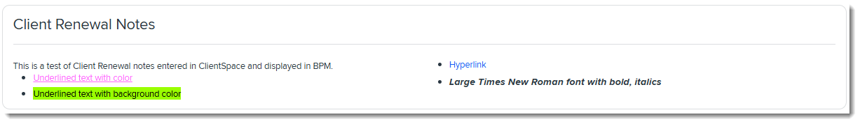 Changed "Client Renewal Notes" Field to an Editor Field Previously, the Client Renewal Notes field in BPM on the Selection Summary/Signature page was a TextArea field datatype that could not support the display of advanced text formatting, hyperlinks or images while the Client Renewal Notes field in ClientSpace on the Benefits Batch dataform is an Editor field datatype that does support advanced formatting. Because of the datatype difference, if the Client Renewal Notes entered in ClientSpace contained any advanced formatting, it could not be displayed in BPM. Now, the Client Renewal Notes field in BPM is an Editor field datatype that displays advanced formatting from ClientSpace in BPM as shown in the example below: See: |