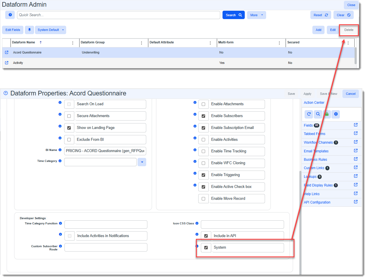 When the System flag is enabled for a dataform in the Dataform Properties, and you select the dataform on the Dataform Admin dashboard, the Delete button on the toolbar is dimmed and disabled: When the System flag is enabled for a field in the Dataform Field Properties, if you are a Global Administrator, the Delete button is gray and inactive. If you are a Developer user, you can still click the Delete button on a field in the field properties grid for the form, but the following message displays: "This field is marked as a System field.": Note: