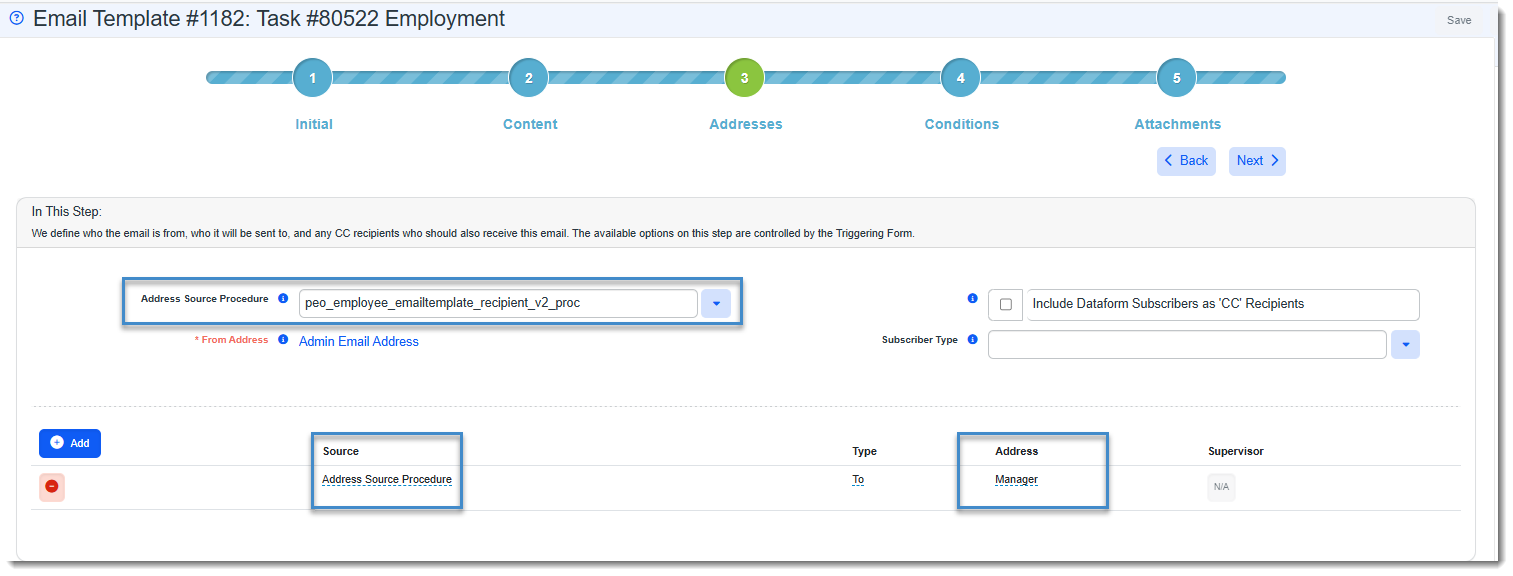 Modified Existing Server Data Procedures to Retrieve Employee Manager Email Address Two new server data procedures have been added to ClientSpace for use on email templates to connect the Manager field on the Employment form to the Manager's email address on the Employee form and facilitate retrieving their email address on email templates triggered by a direct report's Employee record, Employment record or PrismHR Direct Deposit Event record: