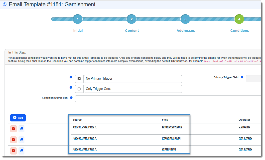 Added Garnishments Server Data Procedures to Retrieve Garnished Employee Name and & Email Addresses Two new server data procedures have been added to ClientSpace to facilitate retrieving the garnished employee's name, work and personal email addresses from the Employee record associated with their Garnishment record(s) for use on email templates: