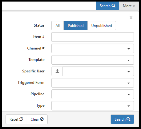 4. In More search, you can further refine the criteria by Item #, Channel #, Template, Specific User, Triggered Form, Pipeline, and Type. The default setting is to search for items with the Status of Published. You can change this to All or Unpublished.