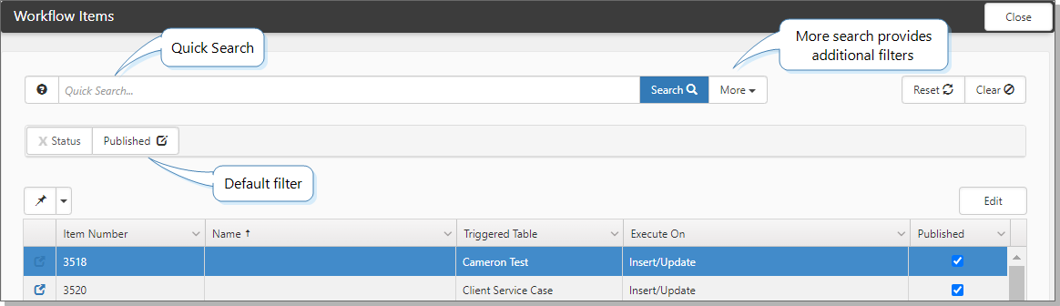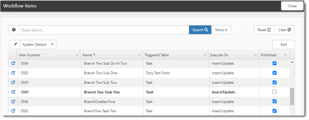 The system displays the filtered list. If the filtered list includes unpublished workflow items, they will display in italics and bold with the Published checkbox unchecked. Published workflow items display in normal text with the Published checkbox checked.
