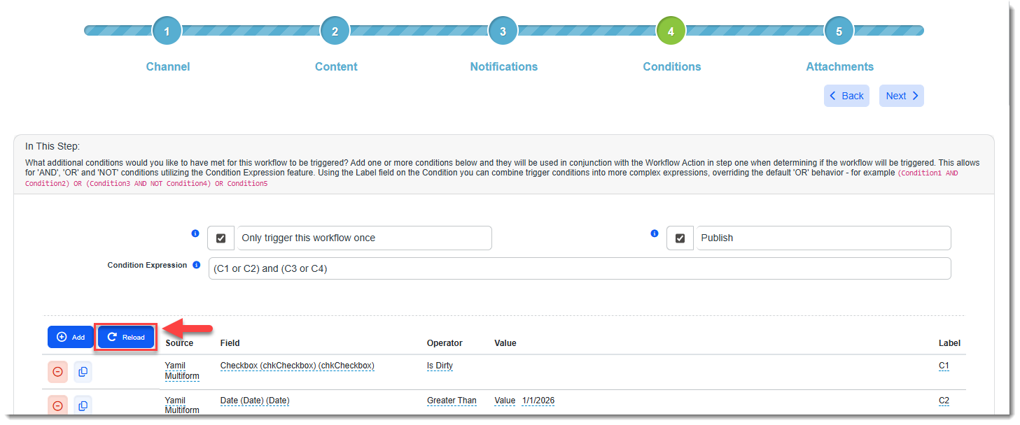 The Reload button located above the secondary conditions grid is used to restore the conditions in the grid if they do not load properly.