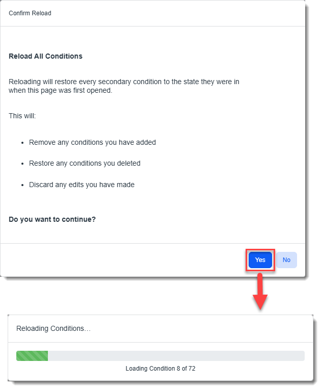 Reload reverts the grid to the original state it was in so that none of the secondary conditions are overwritten with empty values stemming from the loading issues. Reload does not retain any changes you made to the secondary conditions grid while it was in the improperly loaded state. When you click the Reload button, a confirmation message displays indicating that reloading will restore secondary conditions to the state they were in when the page was first opened and will remove additions, deletions and other edits. Clicking Yes starts the restore process. A status bar displays the progress: