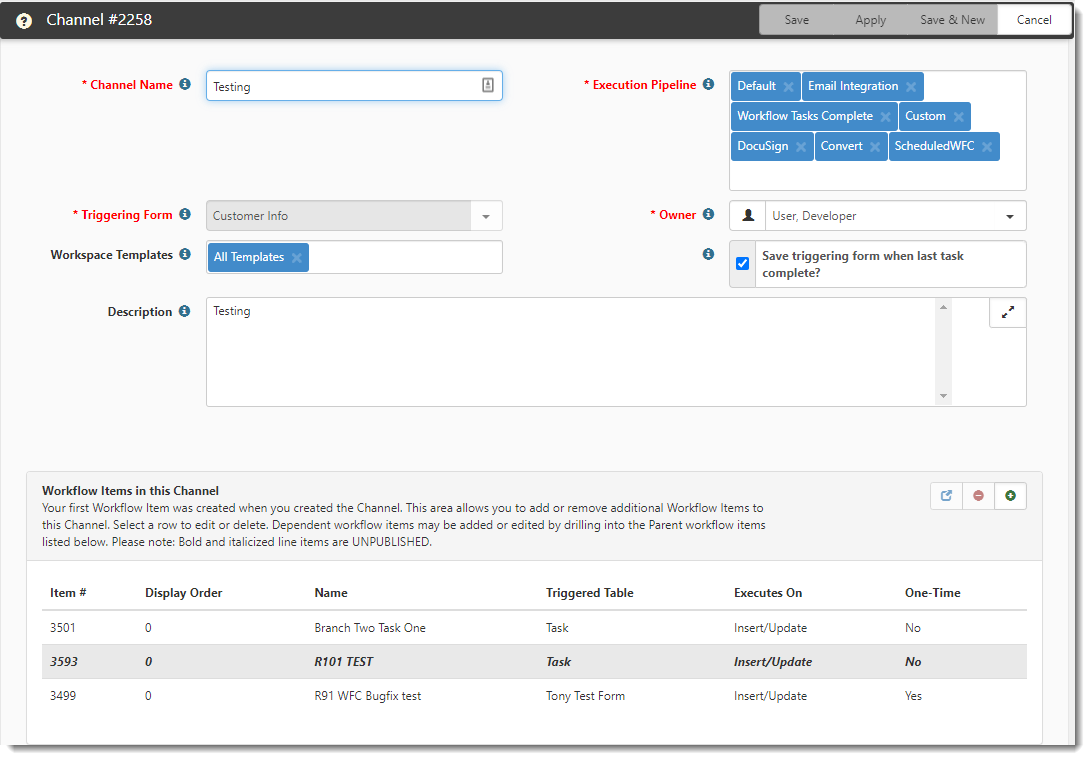 Workflow Channels can contain many workflow items, and each item can have dependent workflow items. You can add, edit, and remove workflow items from the channel using this interface.