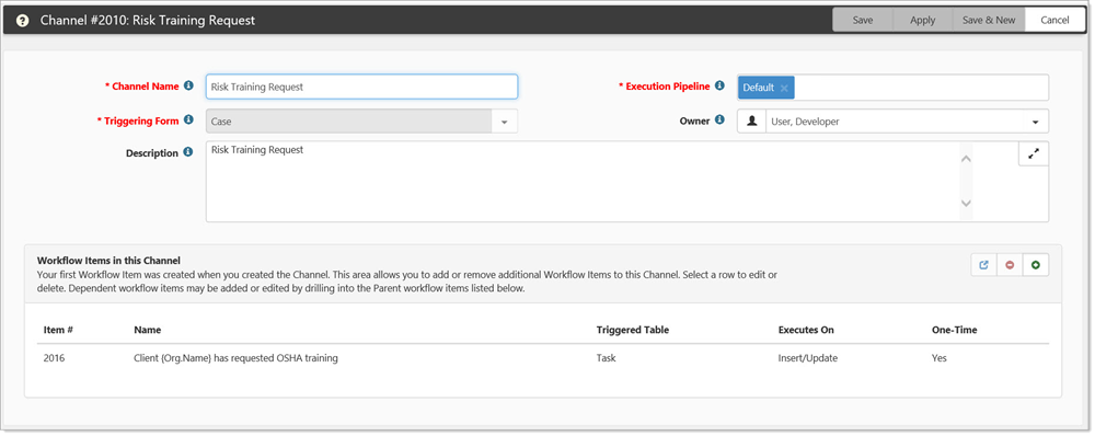 When you have completed the four-step process for creating a workflow channel, you are returned to the Channel. Channel is the top-level item that can have multiple workflow items, all potentially triggered from unique conditions. In our example, a Risk case in the Southeast region could generate a different workflow than the same case in the Northwest region and so on. All these top-level Workflow items are attached to the Workflow Channel.