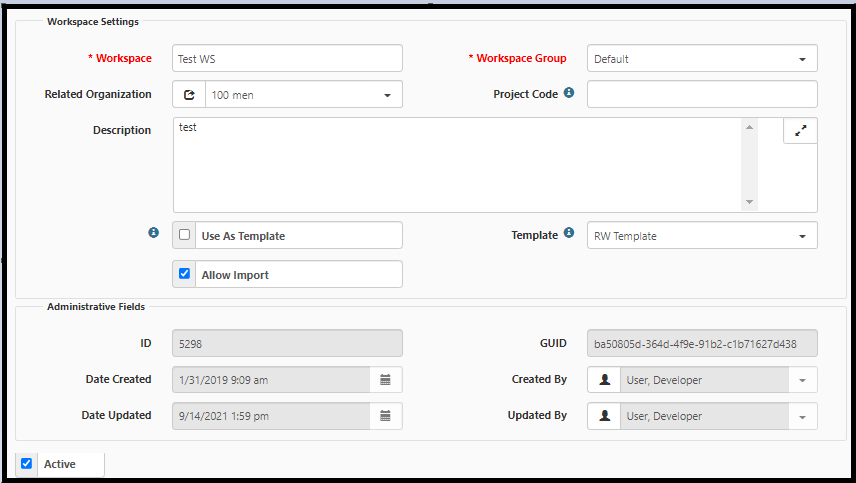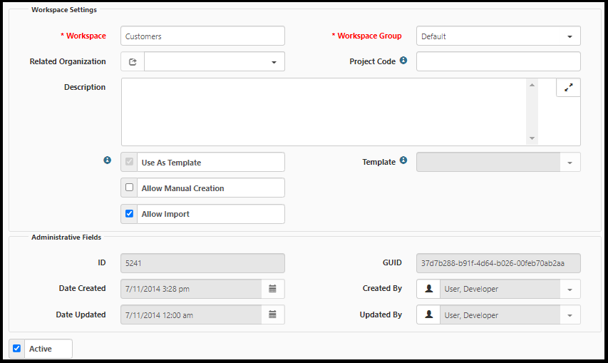 Workspace Settings Fields Field Description Workspace Indicates the name of the workspace. Workspace Group Indicates the workspace group to associate with the workspace. Related Organization Indicates the name of an organization to associate with the workspace. Project Code Indicates a unique code to associate with the workspace. Description Enter text to describe the workspace. Use As Template Indicate whether to use these workspace settings as a template for use when creating or maintaining other workspaces.
