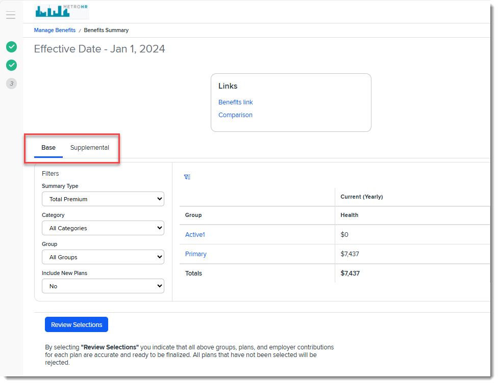 The default Summary Type is Total Premium when you are viewing the Base tab. The default value (and only available value) is Employee Contribution when you are viewing the Supplemental tab.