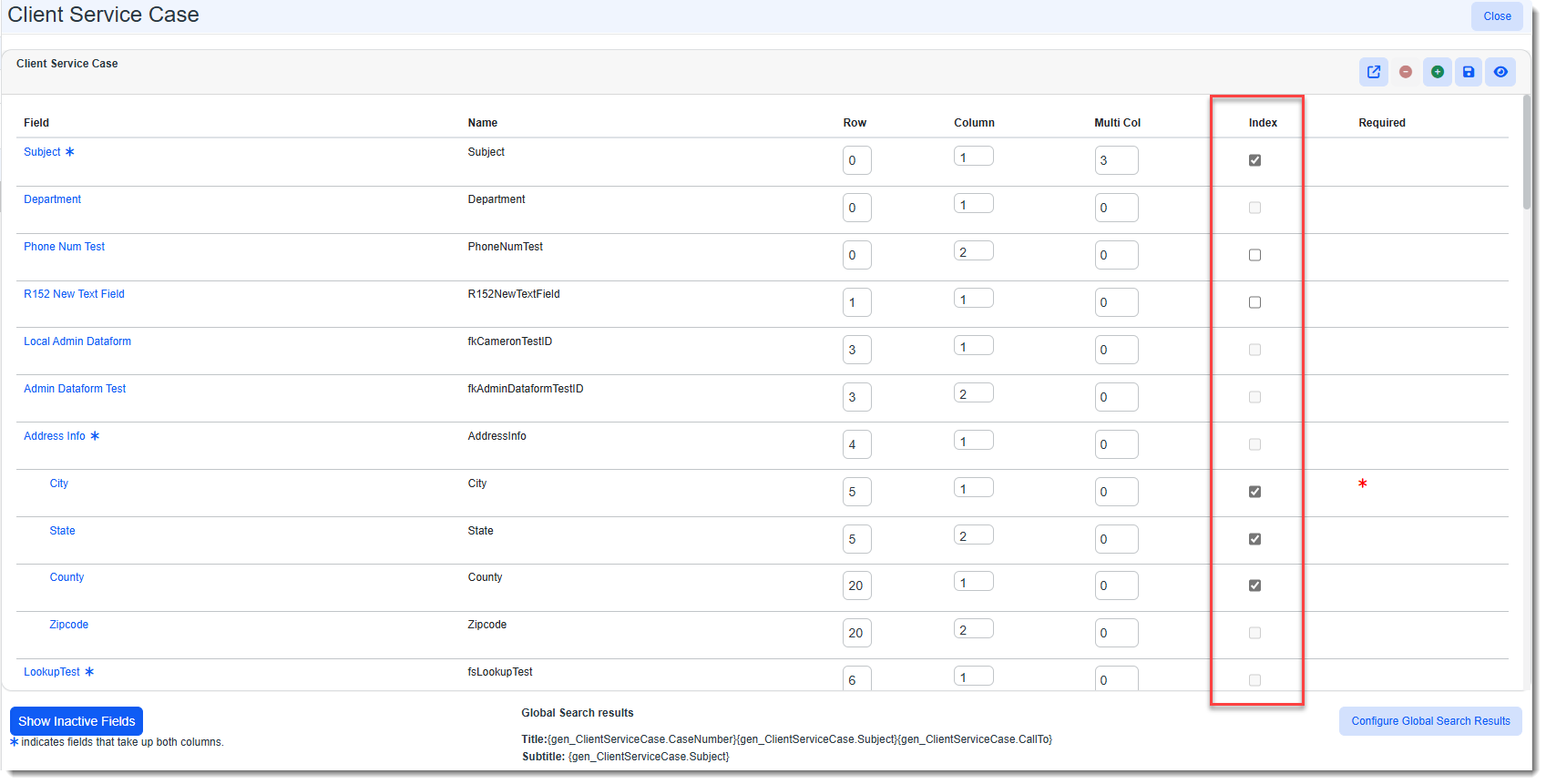 Click the Index column checkbox next to the fields you want to include in the Global Search for this dataform.