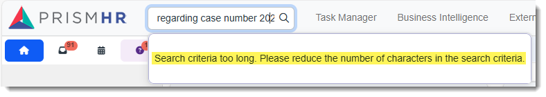 If you enter over 100 characters, the following error message displays: "Search criteria too long. Please reduce the number of characters in the search criteria."