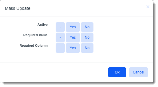 Note: Clicking the "-" button keeps the current settings in place. Selecting Yes adds a checkmark to a checkbox field. Selecting No unchecks a checkbox field.