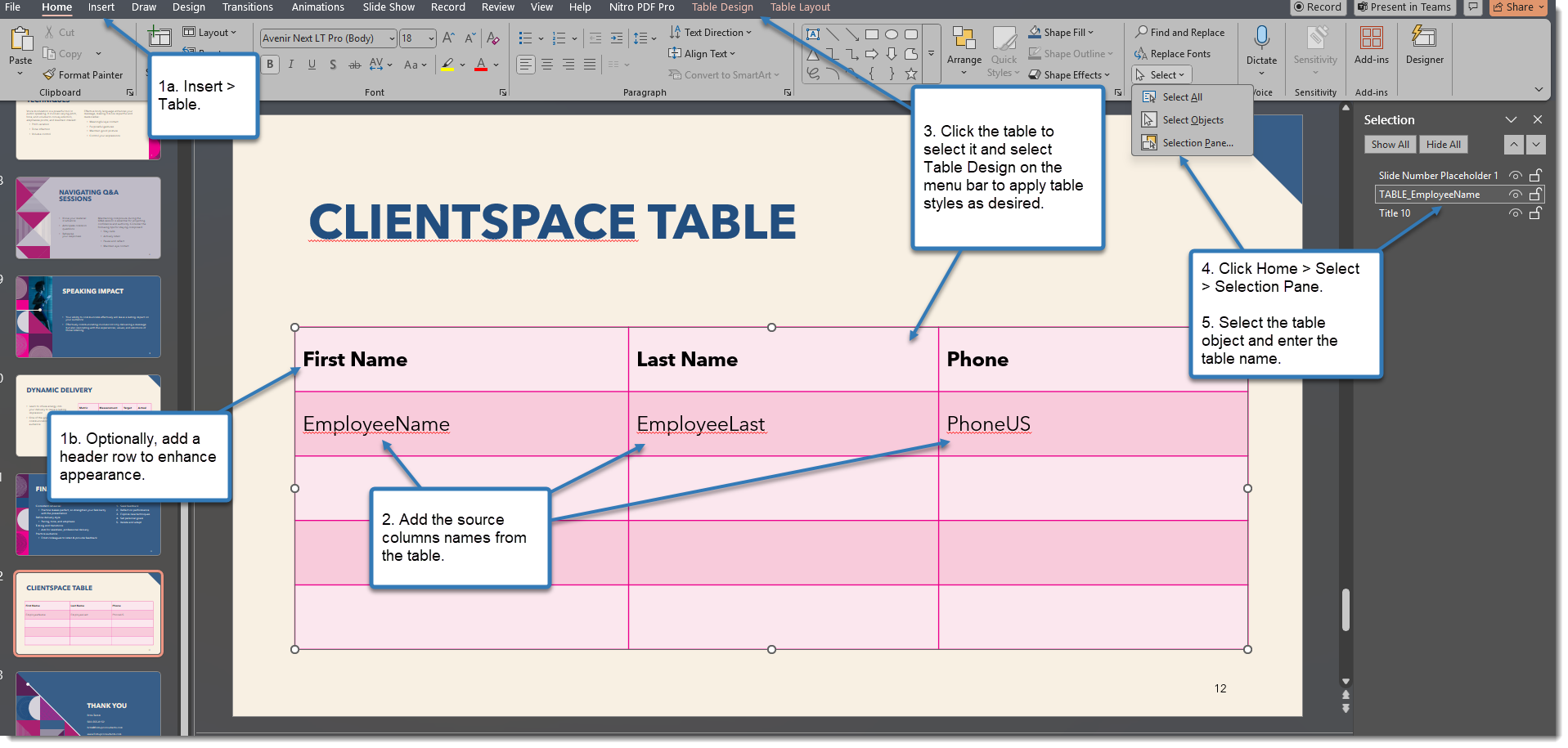 In the first non-header cell of the PowerPoint table, enter the names of the ClientSpace source columns.