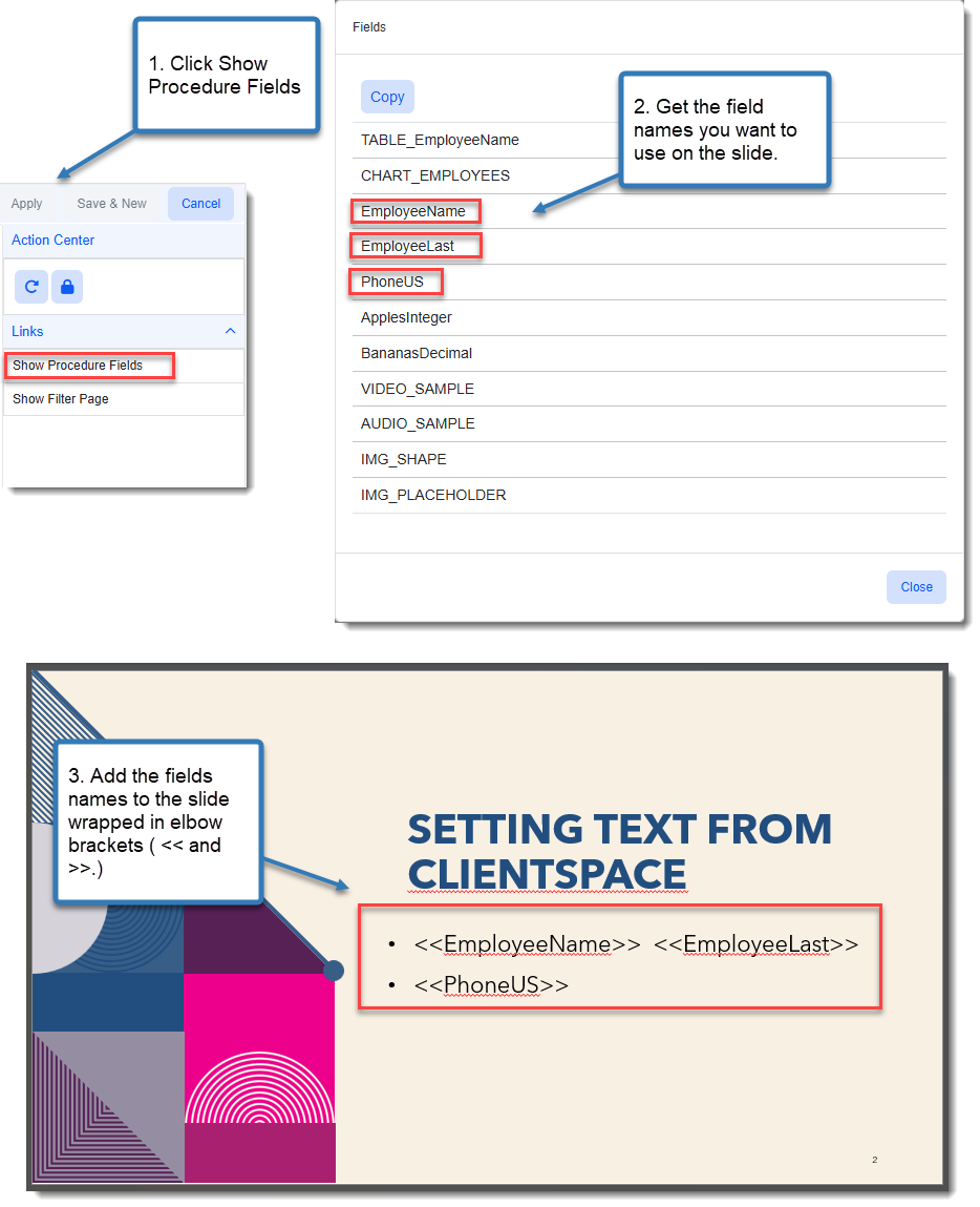 Add replacement fields (i.e., placeholder fields) wrapped in elbow brackets (<< and >>) to your PowerPoint slide like this example: <<EmployeeName>>.
