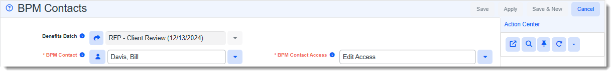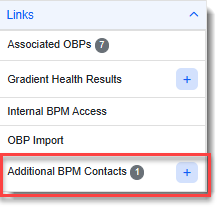 The Renewal Client Contact is automatically added as a BPM contact. Other BPM contacts are manually added from the Benefits Batch by clicking the Add The Additional BPM Contacts Action Center link has a counter badge which shows the number of BPM contacts at-a-glance. Clicking the link opens the BPM Contacts record if there is only one contact saved. If there is more than one contact, the link opens the BPM Contacts dashboard where you can search and select a contact record to open. Note: