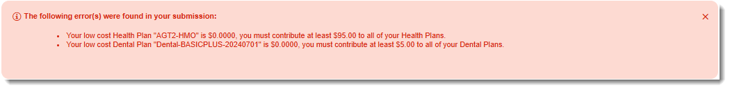 The following error message displays based on parameter configuration: Your low cost [Benefit Plan Category] Plan "[Plan Name]" is $[Employer Contribution Amount], you must contribute at least $[Calculated Minimum Contribution] to all of your [Benefit Plan Category] plans. An example error message displays below: |