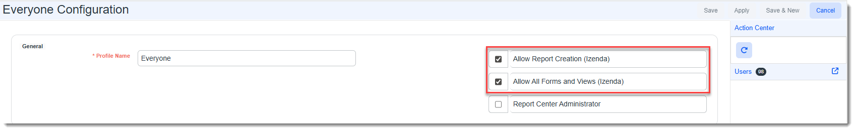 Updated Reporting Profile Configuration to Allow Specifying a Sigma "Report Center Administrator" In preparation for the Business Intelligence model's transition from the Izenda reporting system to the Sigma Report Center reporting system, we have added a new Report Center Administrator profile and a new Report Center Administrator checkbox to the Reporting Profile configuration window (System Admin The Report Center Administrator checkbox is checked by default on the Report Center Administrator profile as shown in the example below: The Report Center Administrator checkbox is unchecked by default on all other pre-existing Reporting Profiles. This gives a user with Developer access the flexibility of assigning Report Center administrator access to an existing profile. Note: The Report Center Administrator field is visible but dimmed and inaccessible (i.e., grayed) if you are not logged in as a Developer user. When Report Center Administrator is checked on a profile, any existing Tables and Views (on the Action Center of the Reporting Profile record) are copied from the existing Administrator Reporting Profile to this profile. Additional changes include: