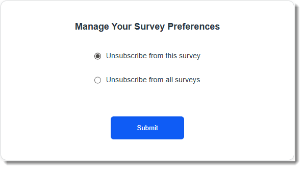 Added Survey "Unsubscribe" Feature and Made Survey Template Selection Required Survey recipients are now allowed to either unsubscribe from the current survey or from all surveys by clicking a link in the survey body which is automatically appended to the end of the survey email similar to the following: When the link is clicked a "Manage Your Survey Preferences" window displays which allows the user to unsubscribe from the current survey or from all ClientSpace surveys: To track unsubscribed users, two new recipient tables have been created: