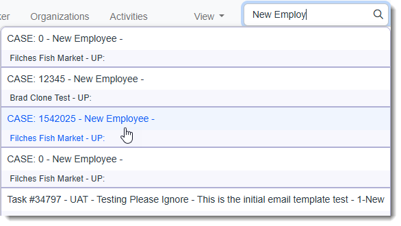 When the Global Search bar is enabled, it appears on the Modules bar: Once configured, it is always visible, allowing you to search the ClientSpace system by keyword or phrase from one location for related cases, tasks, activities, attachments and more. If results are found, they display in a drop-down list: Click an item in the list to open the associated record. See Searching in ClientSpaceand Global Search. Also see related Case# 74672 (Global Search Configuration). |