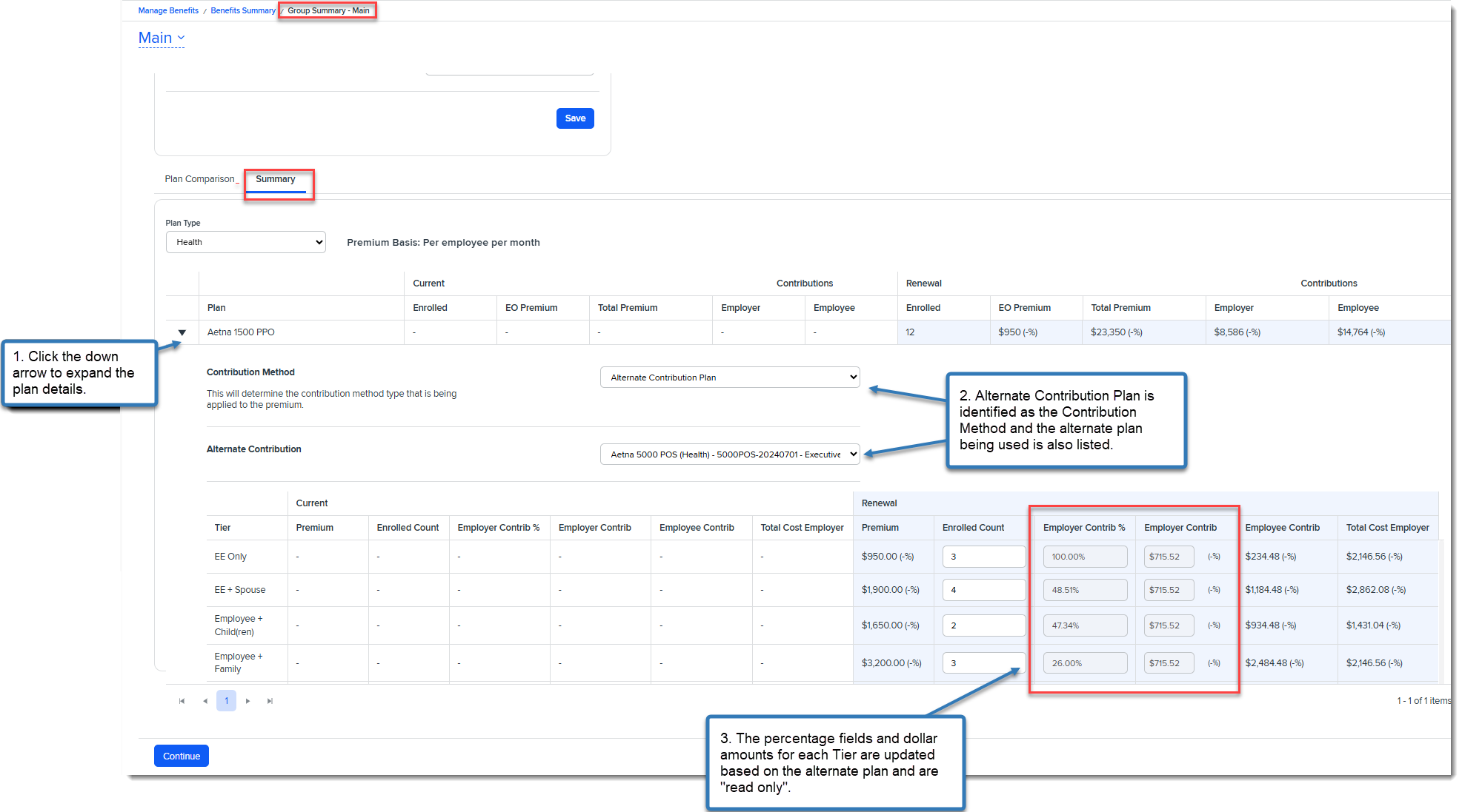 Added Support for New "Alternate Contribution Plan" Contribution Method in BPM Support for the new Alternate Contribution Plan Employer Contribution Method has been added to BPM. When this option is selected for a plan in ClientSpace, all of the Employer Contrib% and Employer Contrib Coverage Level (i.e., Tier) percentage fields and dollar amounts are also updated in BPM on the Group Summary > Summary tab and flagged as "read only". See related Case# 73552 for additional details. |