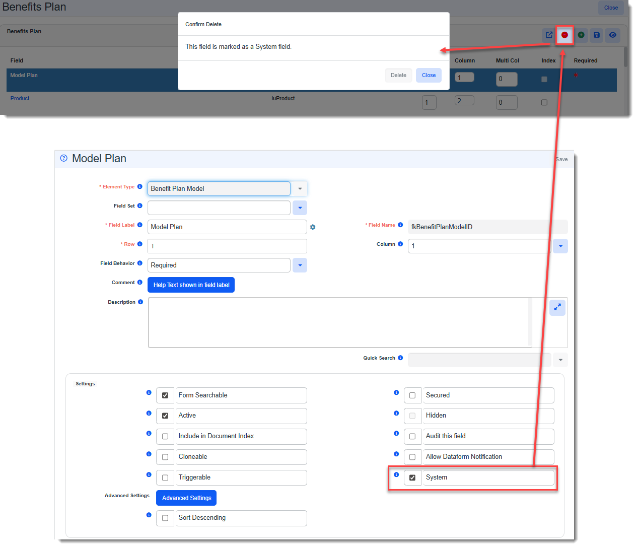 When the System flag is enabled for a dataform in the Dataform Properties, and you select the dataform on the Dataform Admin dashboard, the Delete button on the toolbar is dimmed and disabled: When the System flag is enabled for a field in the Dataform Field Properties, if you are a Global Administrator, the Delete button is gray and inactive. If you are a Developer user, you can still click the Delete button on a field in the field properties grid for the form, but the following message displays: "This field is marked as a System field.": Note: