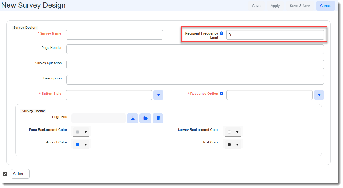Added Recipient Frequency Limit Setting to Survey Design Form A Recipient Frequency Limit field has been added to the Survey Design form. The value in the field defaults to 0 and represents the number of days between the date the survey was last sent and the current date that must pass before the survey can be sent to a recipient again.