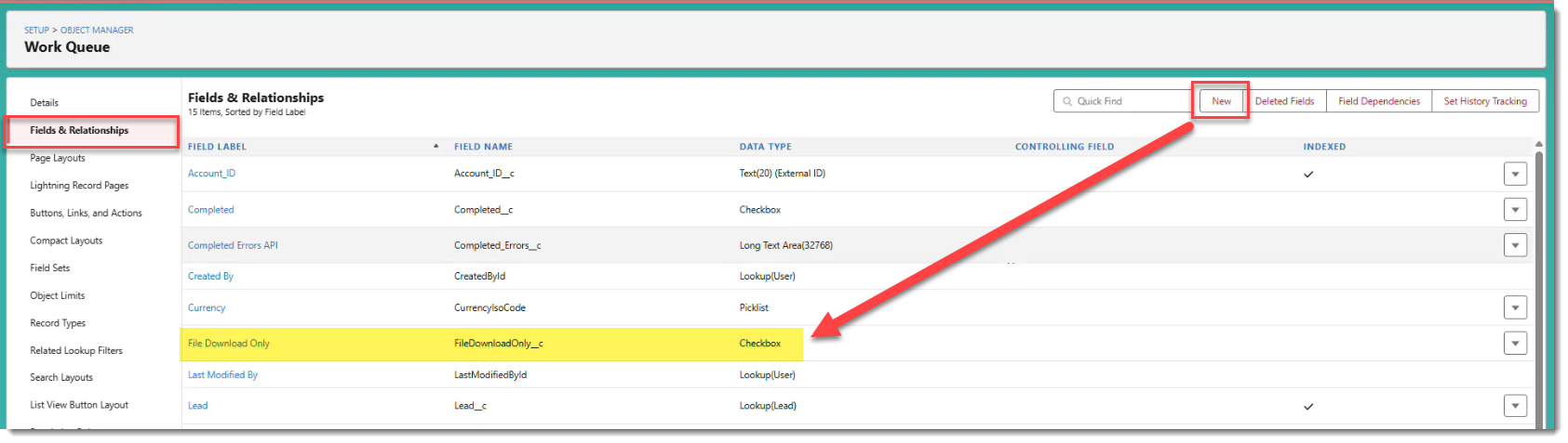 In Salesforce Work Queue Configuration settings (Setup > Object Manager > Work Queue > Files & Relationships), a Salesforce Administrator must create a custom checkbox field named FileDownloadOnly__c .