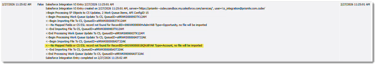 Note: This same event is also recorded when the import map header file is missing or inactive. The "CS ESL record not found" portion of the message means that ClientSpace cannot find an External Source Linking (ESL) record that matches the Salesforce Account or Opportunity. The Salesforce Account or Opportunity may exist in Salesforce but may not have been imported into ClientSpace yet.