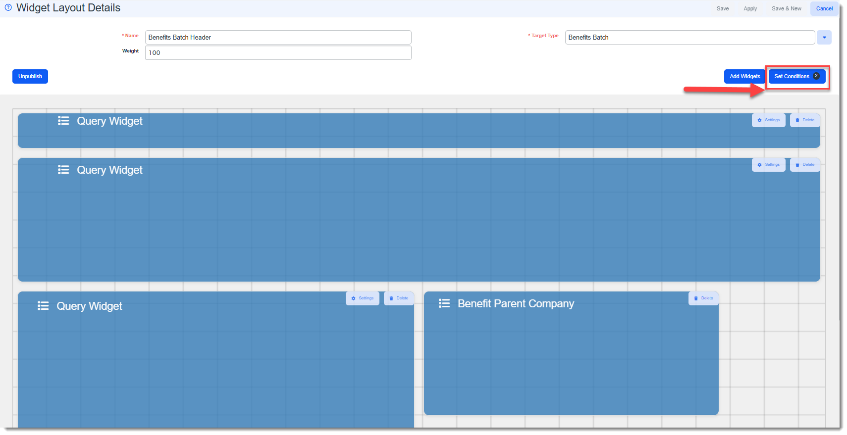 Note: You can also optionally add widget layout filter condition statements in the widget layout configuration to display the Benefit Parent Company Widget on Benefit Batches whether the batch is a parent or child OR set a condition to only show the widget on a parent Benefit Batch. See the Setting Benefit Parent Company Widget Filter Conditions section of this document for steps to set the conditions on the widget.