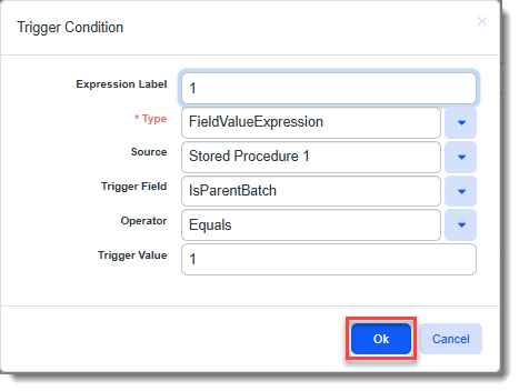Type FieldValueExpression Source Stored Procedure 1 Trigger Field IsParentBatch Operator Equals Trigger Value